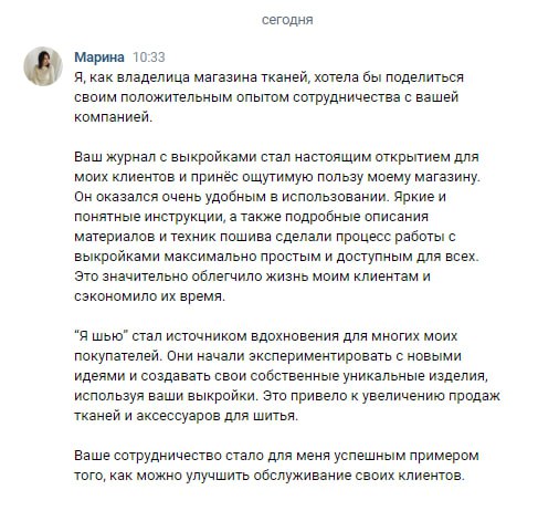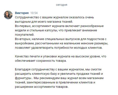 Работая с нами, вы не только расширяете ассортимент своего магазина качественными журналами которые привлекают внимание, но и повышаете средний чек, за счет покупки необходимой ткани и фурнитуры для создания образа по журналу